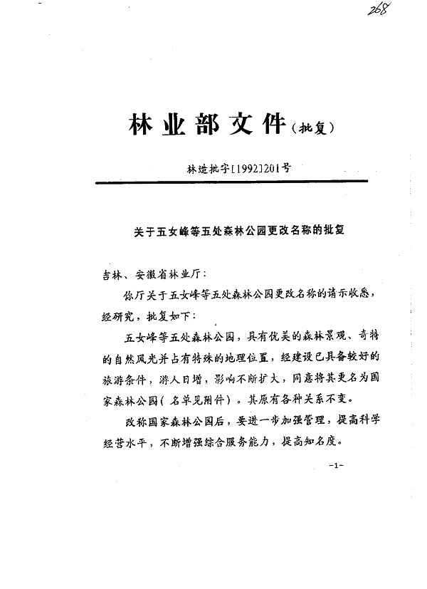 关于五女峰等五处森林公园更改名称的批复